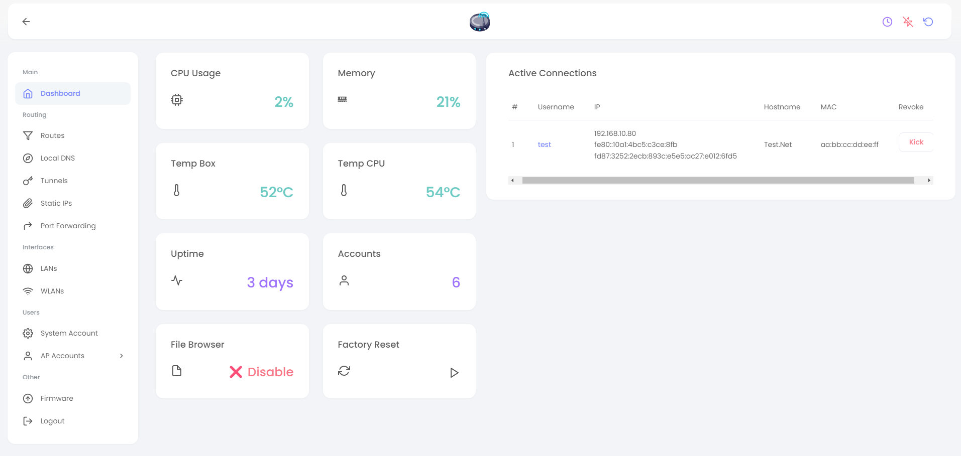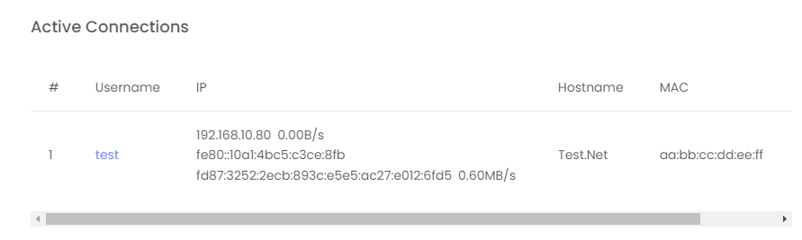 در این بخش نشست های فعال روتر نمایش داده میشوند. در این لیست میتوانید لیست دستگاهها + آدرس آیپی داخلی آنها و همچنین اکانتی که با آن احراز هویت کردهاند را مشاهده نموده و در صورت لزوم آن ها را قطع (Kick) نمایید.