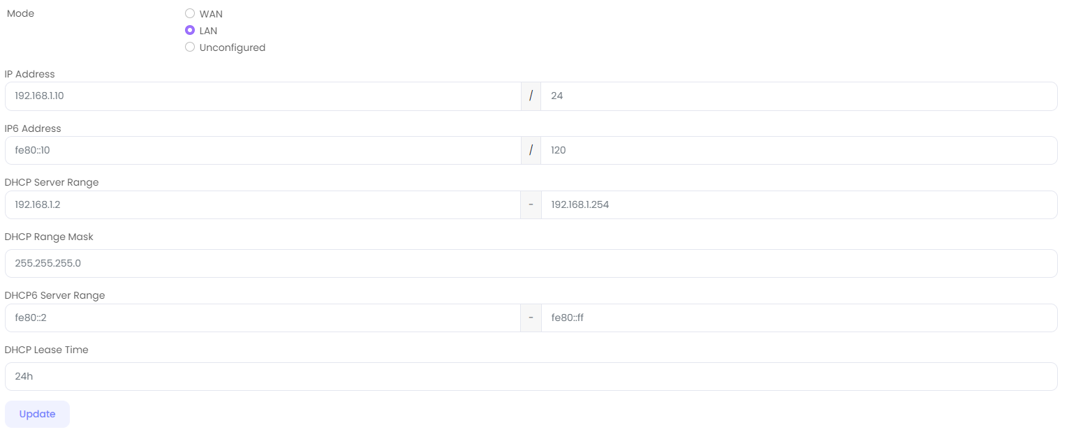 برای استفاده از این حالت باید یک آدرس آی پی ورژن 4 و ورژن 6(اختیاری) به رابط شبکه اختصاص دهید. سپس رنج آی پی را مشخص کنید. DHCP Server روتر بر اساس رنج تعیین شده به دستگاه هایی که به آن متصل میشوند آی پی میدهد.