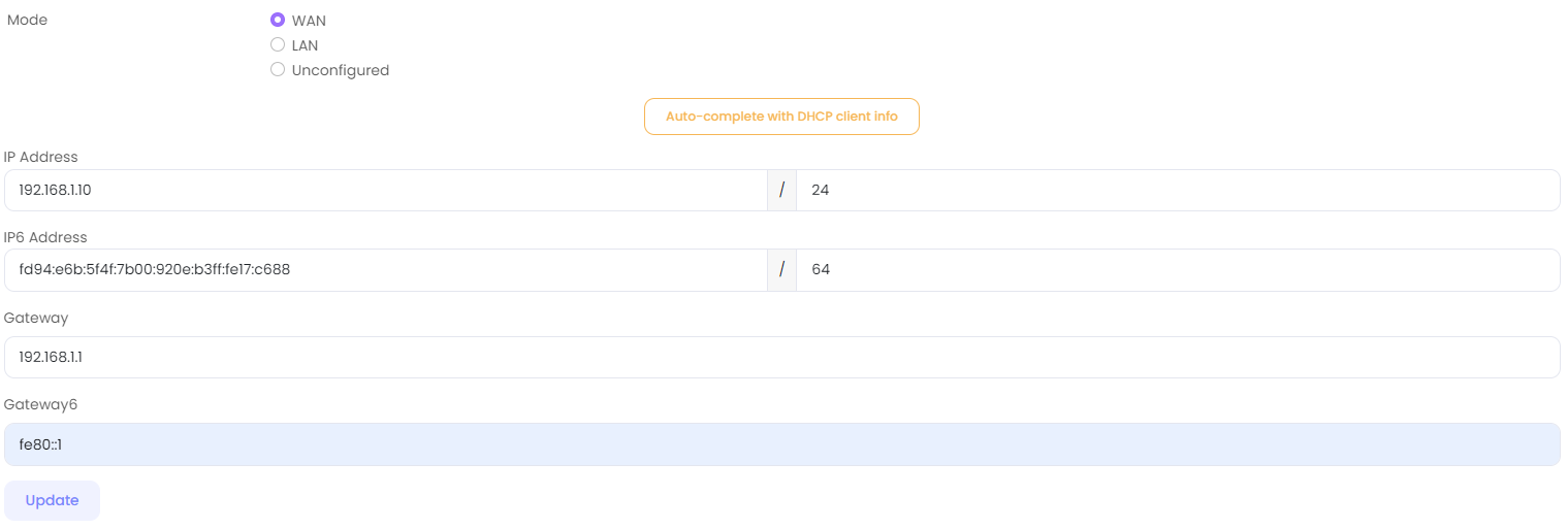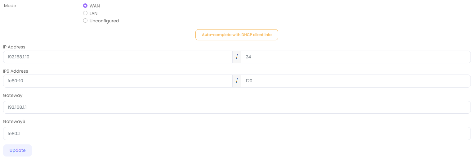7- از قسمت mode گزینه WAN را انتخاب کرده و سپس کلید Auto-complete with DHCP client info را بزنید تا اطلاعات بصورت خودکار پر شود.