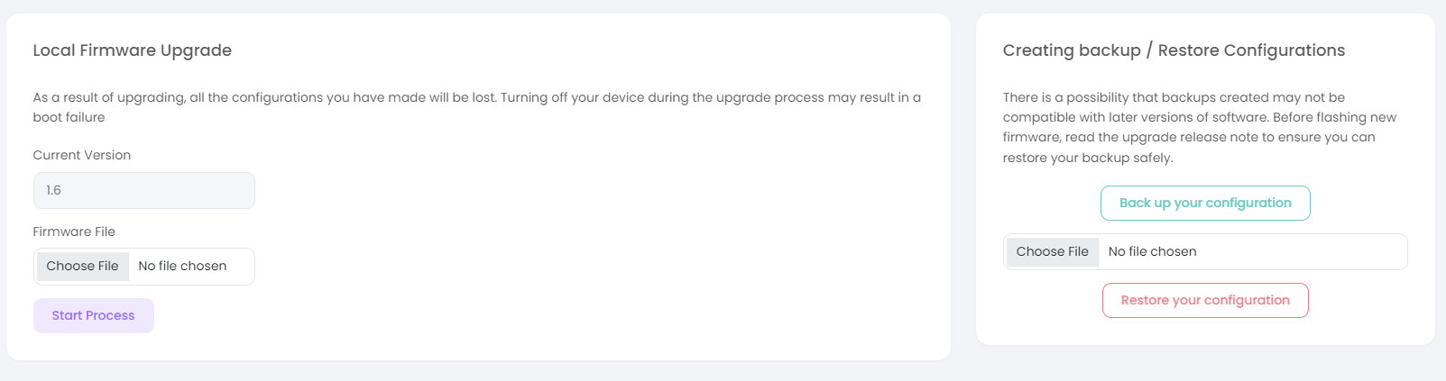 صفحه Firmware از دو بخش Local Firmware Upgrade / Creating backup / Restore Configurations تشکیل میشود که عملکرد هر یک از این بخش ها به شرح زیر است: