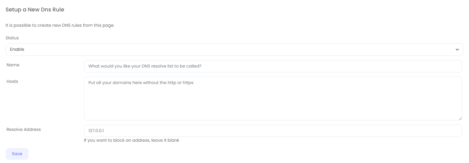 Resolve Address آدرس آیپی که دامنههای مشخص شده توسط شده شما در این قانون به آن Resolve میشود وارد نمایید. برای بلاک کردن کامل این فیلد را خالی بگذارید.