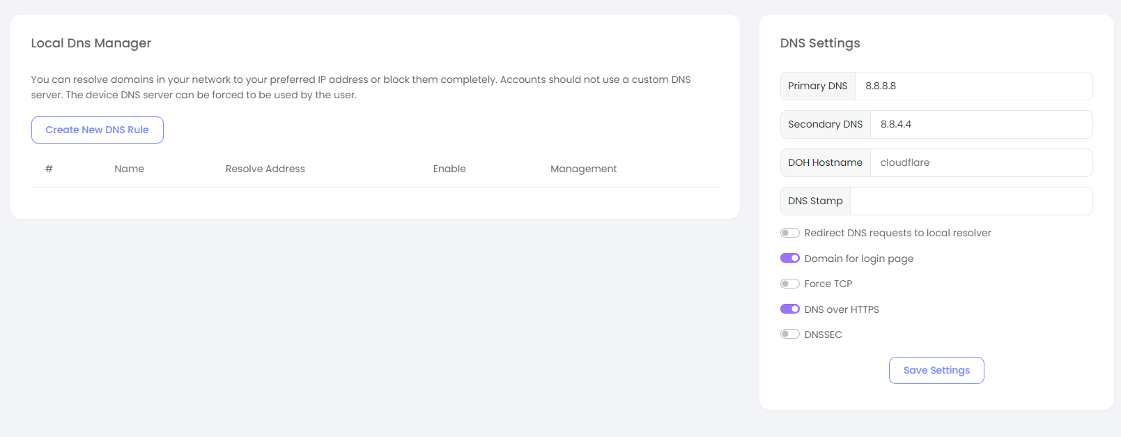 پس از ورود به بخش Local DNS تنظیمات زیر برای شما نمایش داده میشود. این صفحه از دو بخش DNS Settings و Local Dns Manager تشکیل شده است که در ادامه به توضیح هر یک میپردازیم.
